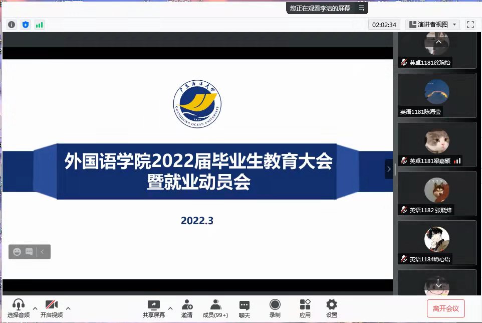 为进一步做好2022届毕业生毕业教育和就业工作,3月9日和10日晚上外国语学院分别在线上召开英语系、日语系的毕业生年级大会暨就业动员会,学院院长郭遂红、党委副书记刘艳、副院长何谦卫、副院长安丰科、系主任、毕业班辅导员、班主任以及2022届毕业生参会。