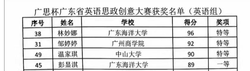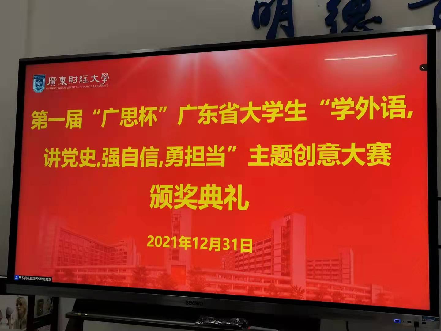 12月31日,首届“广思杯”广东省大学生“学外语,讲党史,强自信,勇担当”主题创意大赛决赛在广东财经大学广州校区圆满落下帷幕。开云官网学生林妙娜以排名第一的成绩荣获英语专业组特等奖,彭显淇同学以排名第四的成绩荣获英语专业组一等奖,黄嘉茵同学荣获非英语专业组三等奖。开云官网因比赛组织有力、成绩突出荣获“优秀组织奖”。