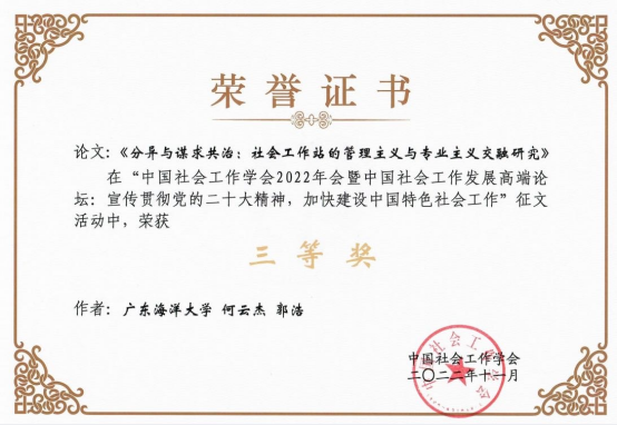 近日,由郭浩老师指导,法政学院社会学专业何云杰同学会议论文《分异与谋求共治:社会工作站的管理主义与专业主义交融研究》获“中国社会工作学会2022年会暨中国社会工作发展高端论坛”优秀论文三等奖。