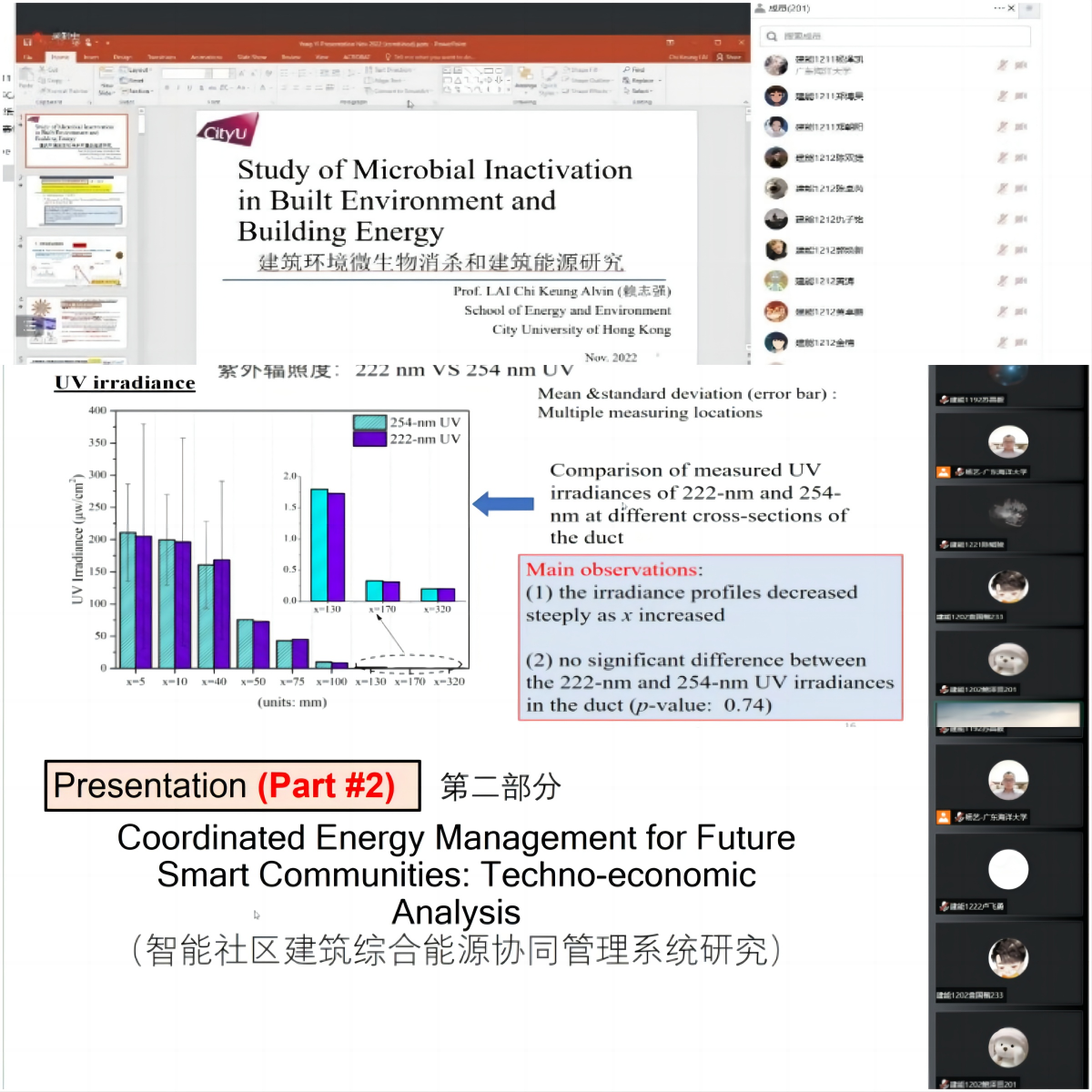 赖志强教授在报告中主要讲述了室内环境空气消杀和建筑分布式能源及储能应用,介绍了建环环境中微生物消杀菌消毒手段及其应用研究成果,和智能低碳社区能源管理系统。与会人员就气载微生物消杀技术和能源管理系统相关问题进行了热烈讨论,赖志强教授作了一一解答。