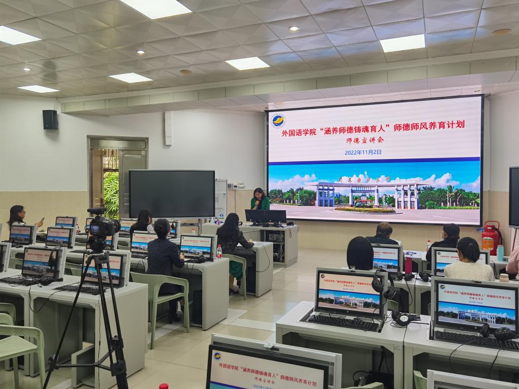 为进一步加强教师职业道德建设,营造良好师德师风氛围,提升教师队伍整体素质,11月2日下午,外国语学院在湖光校区兴教楼110室举办了“涵养师德铸魂育人”师德师风养育计划之师德宣讲会。宣讲会邀请了学校师德宣讲团成员、英语系主任毛妙维副教授作宣讲,外国语学院正处级辅导员、党委副书记刘艳主持,学院全体教师到场聆听宣讲会。