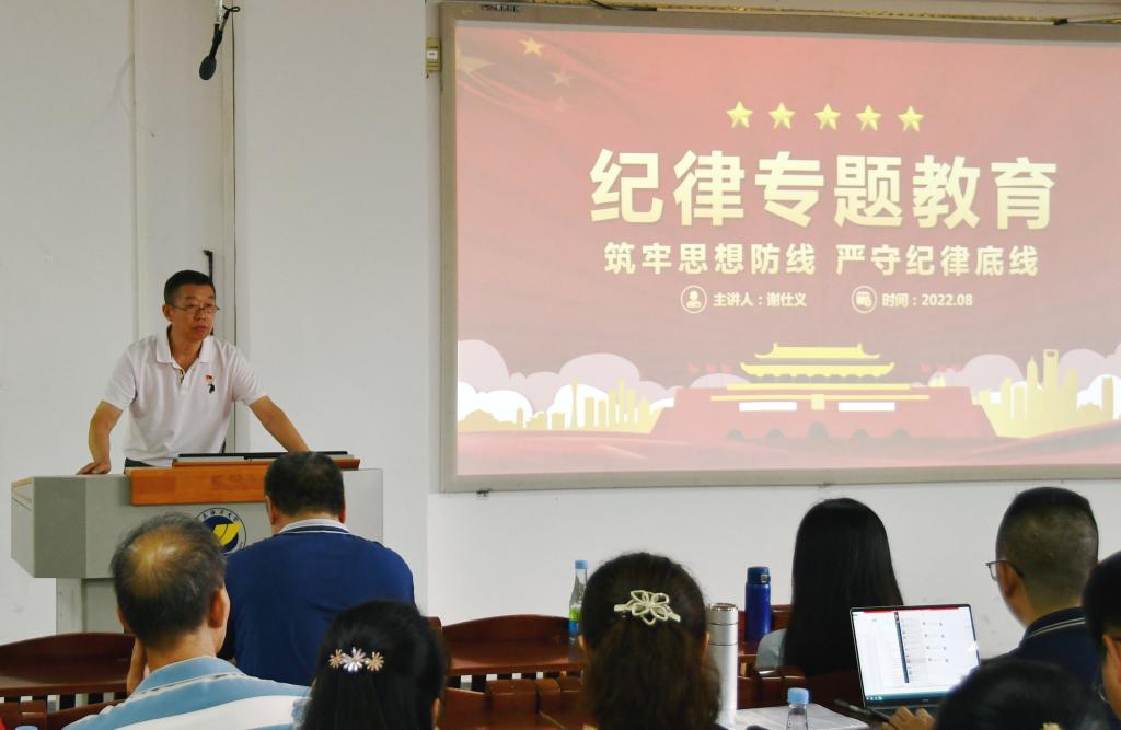 谢仕义从活动主题、教育内容、工作安排等方面,对学院2022年纪律教育学习月活动进行了全面部署,并从强化主体意识、加强组织领导、紧密结合工作实际、增强教育实效、做好信息报送等方面提出了四点具体工作要求。随后,他以“筑牢思想防线 严守纪律底线”为题作专题辅导报告,详细诠释作为一名共产党员应如何在思想境界上强化“四种”意识,在道德修养上做到“五慎”,在实际行动上把好“三关”。谢仕义指出清正廉洁是中华民族的传统美德,也是我们党的优良传统,学院全体党员干部要在政治上跟党走、经济上莫伸手、作风上解民忧、工作上争上游,坚定理想信念,实现人生价值,以实际行动迎接党的二十大胜利召开。