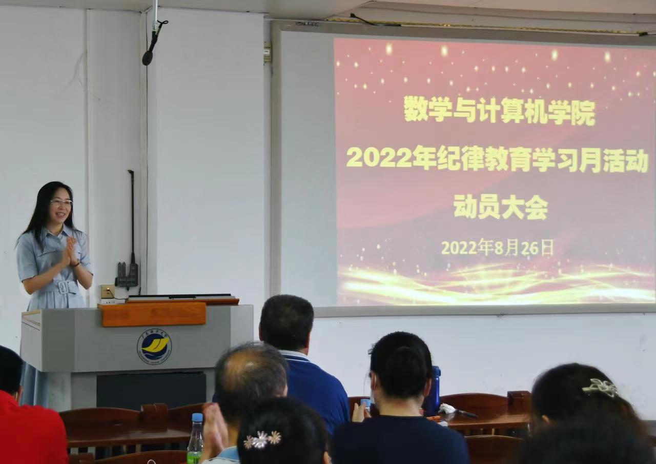 8月26日上午,数学与计算机学院2022年纪律教育学习月活动动员大会在湖光校区明德楼A103会议室召开,学院全体党员干部参加会议。学院党委书记谢仕义作动员讲话并作专题辅导报告,院长彭小红主持会议。