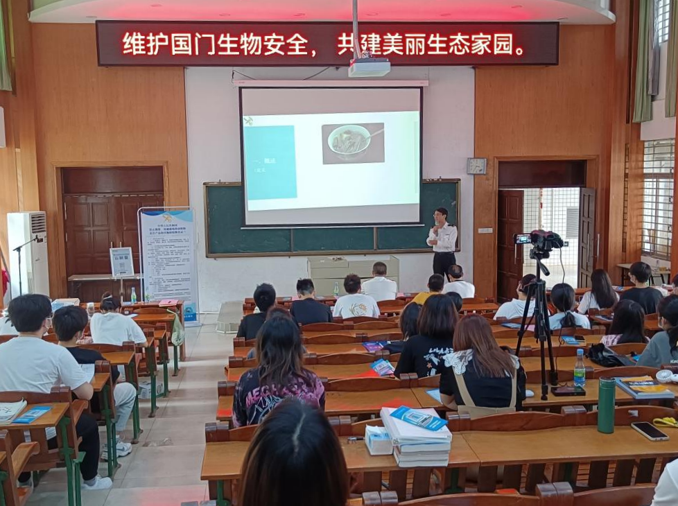 通过观看海关制作的宣传片,同学们对生物病(毒)、虫源的种类、危害和传播方式有了大致了解。湛江海关派出专家以《中华人民共和国生物安全法》为视角,强调维护国家安全,人人有责。重大传染病和生物安全风险是事关国家安全和发展、事关社会大局稳定的重大风险挑战,专家勉励同学们努力学好专业知识,共同为守护好生物安全国门做贡献;以《浅谈外来物种入侵》为主题,讲述了“海关检疫把关职责、生物安全的意义、外来物种的概念、入侵途径、危害以及外来物种防控”等内容,为大家作了一堂生动的讲座。随后现场同学与湛江海关派出干部和专家展开了相关知识的交流与探讨,会场气氛活跃,同学们受益匪浅。