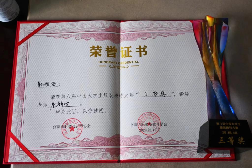 12月22日,第八届中国大学生服装模特大赛总决赛在深圳水贝壹号落幕。来自全国82所院校的105位选手一展身手,为冬日鹏城带来一场赏心悦目的视觉盛宴。经过激烈角逐,开云官网表演(服装表演)2022级郭俊苗同学喜获第八届大学生服装模特大赛男模组三等奖。