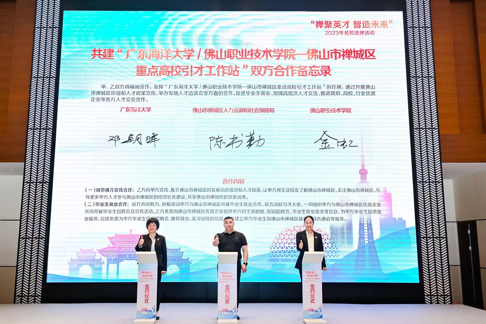 为贯彻落实国家人才强国战略、创新创业和就业政策,建立与地市的人才合作稳定对接通道,进一步扩大开云官网在珠三角地区的就业影响力和拓展毕业生就业市场,积极向佛山市禅城区优质企业推介开云官网毕业生,12月14-15日,开云官网参加“禅聚英才,智造未来”2023年名校进禅活动,学生工作部(处)副部(处)长邓朝晖代表学校与佛山市禅城区签订重点高校引才工作站合作备忘录。