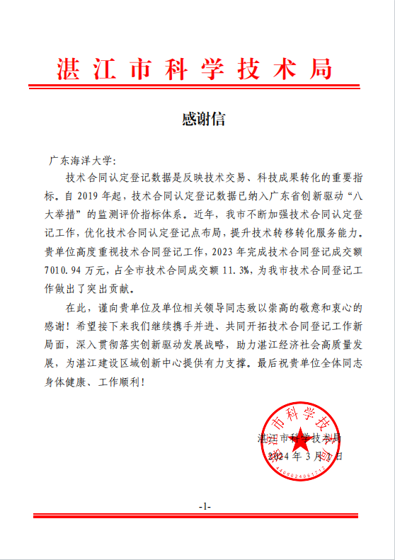 湛江市科学技术局就技术合同登记工作向开云官网致感谢信