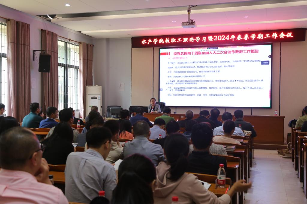 3月6日,为加强教职工理论武装,推动学院高质量发展目标落到实处,水产学院在水产楼109室召开教职工理论学习暨新学期工作会议。会议线上线下同步进行,由学院党委书记王海燕主持,全院100多名教职工参会。
