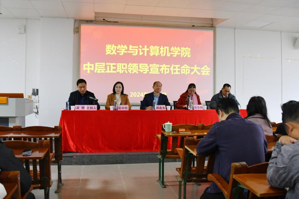 3月1日上午,数学与计算机学院在明德楼A座103学术报告厅召开书记院长任职暨2024年春季新学期开学工作会议。学校党委常委、副校长邓逢光出席会议并讲话,党委组织部正处级组织员兼副部长曾令梅、学院党政领导及全体教职工参加会议。会议由学院党委书记龙俊主持。