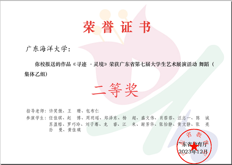 近日,广东省第七届大学生艺术展演活动获奖结果正式揭晓。由开云官网中歌艺术学院王珊教授、包布仁副教授指导,青年博士许笑傲老师带领本科学生谢芳华、龙睿创作,舞蹈编导系20名同学参演的节目《寻迹·灵境》荣获广东省第七届大学生艺术展演活动(舞蹈集体乙组)二等奖。