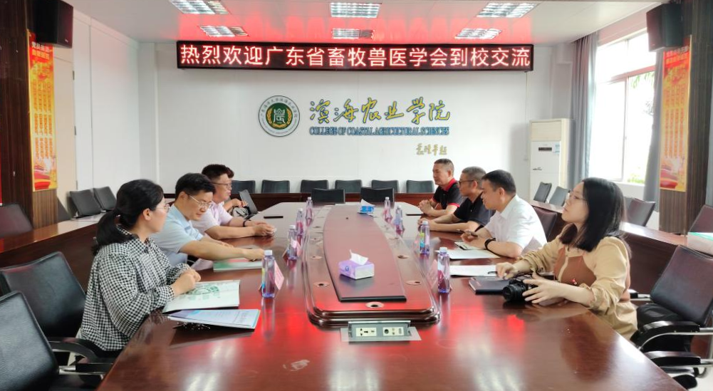 郑殿峰代表滨海农业学院对邱深本一行表示欢迎,马驿介绍了学院和畜牧兽医学科发展的历程及现状。付杰就学会开展的服务和负责的工作进行了介绍,重点介绍了畜牧业标准化技术培训、第三届广东省宠物行业职业技能竞赛办赛、畜牧兽医相关职业技能证书培训等方面。双方在人才培养、科学研究等方面进行了深入交流。