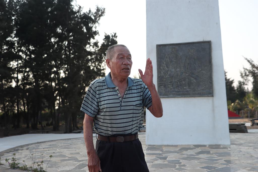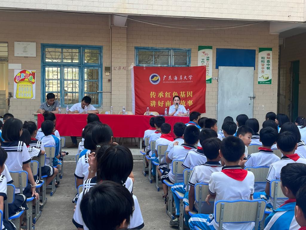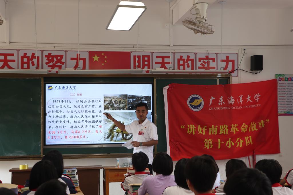 在渡海作战纪念园,全体师生整齐列队,庄严肃穆地面向渡海作战纪念碑默哀,向为革命牺牲的英烈们致以深切的悼念。讲解员向在场师生详细介绍了解放海南岛战役中徐闻人民积极支前,大力开展架桥筑路、主动捐钱捐物,尤其是1000多名船工踊跃报名参加渡海作战等情况。参加渡海作战的船工、革命烈士邓连才的后人邓胜孔老人向师生们深情地讲述了父辈们参加渡海作战的英勇事迹,并回忆起住在村庄里的解放军为渡海作战刻苦训练的情形和船工父辈们积极参战备战的热烈气氛,让当时只有九岁的邓胜孔老人至今仍历历在目。研究生院院长叶国栋在总结讲话中肯定了本次活动的深刻意义,同时向宣讲员们提出要深入挖掘历史细节、持续提升宣讲技能和强化育人效果,寄望宣讲员们以高度的责任感和使命感,继续做好“讲好南路革命故事”的宣讲工作,为传播“南路革命故事”、启迪思考和传承革命精神做出更多的贡献。