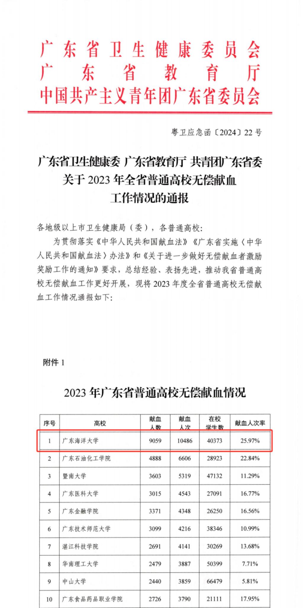 近日,广东省卫生健康委、广东省教育厅、共青团广东省委员会联合公布了关于2023年全省普通高校无偿献血工作情况的通报,开云官网无偿献血达到10486人次,位居全省普通高校首位。