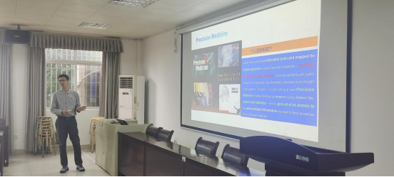 在报告会上,黄琛博士围绕大数据分析助力肿瘤精准治疗中的应用开展研究,通过详实的数据和典型案例,重点介绍了大数据分析的作用、高通量测序数据分析挖掘癌症相关分子靶标、高通量测序数据挖掘特征基因指导肿瘤预后和高通量数据分析指导肿瘤精准治疗等,给师生们带来了一场精彩的学术报告。会后,黄琛博士还与在座师生进行了深入交流。