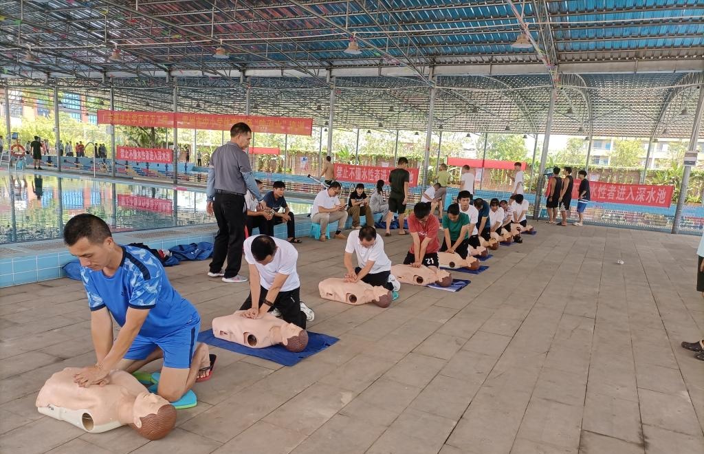 本次培训班采用理论与实践相结合的方式,既有专家专题讲授,还安排有现场教学和实操课程,培训内容丰富,形式多样,针对性强。体育与休闲学院组织建水上教学团队,为参训人员开展防溺讲座和救生技能展示,内容主要包括溺水救援、心肺复苏、救生浮标、救生绳圈使用等实用技能。如抬头爬泳25米+浮标救援25米、潜泳15米+侧泳20米+(环绕、地位)救生绳、抬头蛙泳25米+救生板(清醒、昏迷),心肺复苏讲解与练习,徒手救生(背面、侧面、正面)和浮标救生的讲解与示范。参训人员进行游泳技能测试后,学习和复习熟悉水性、蛙泳、反蛙泳、踩水、入水方式、接近、拖带、上岸、解脱方式、心肺复苏、徒手救生和浮标救生等内容。