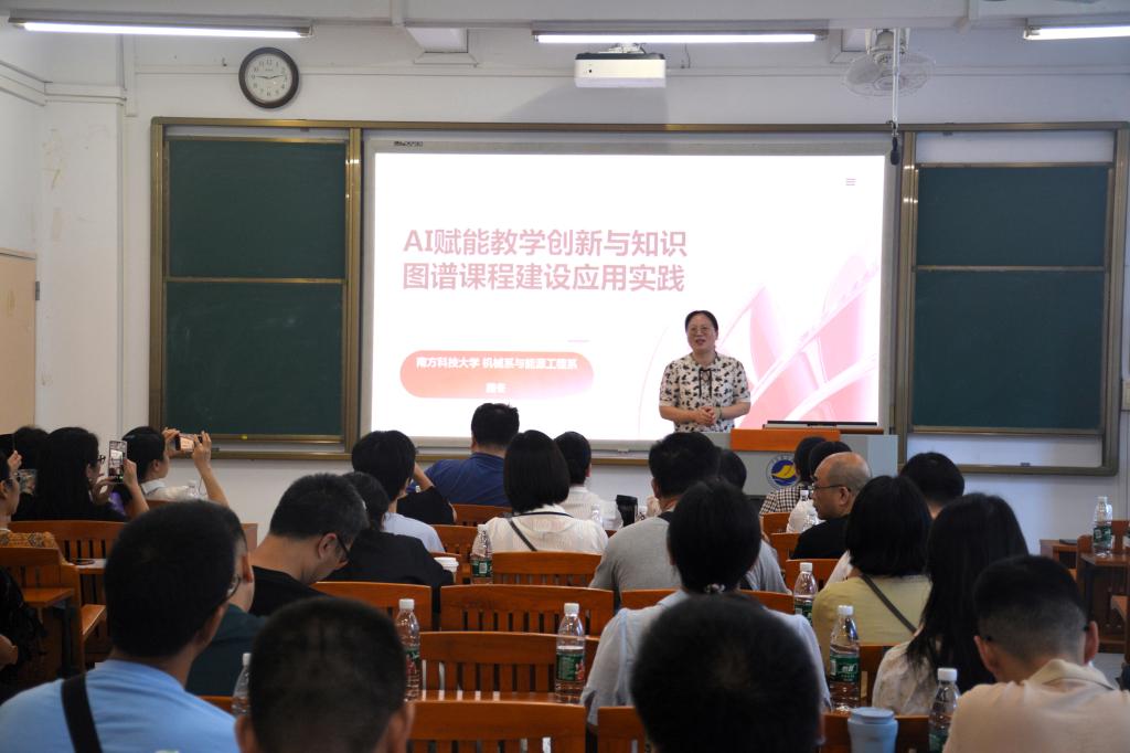 研讨会上,南方科技大学路冬教授作题为《AI赋能教学创新与知识图谱课程建设应用实践》的专题报告。路冬结合日常教学实践分析了AI发展对高校传统教学的冲击,以及这种冲击带来的教学创新和转型的思考,并以其主讲的《制造工程认知实践》课程为例,分享了利用知识图谱改革课程建设并荣获广东省线上一流本科课程的经验。