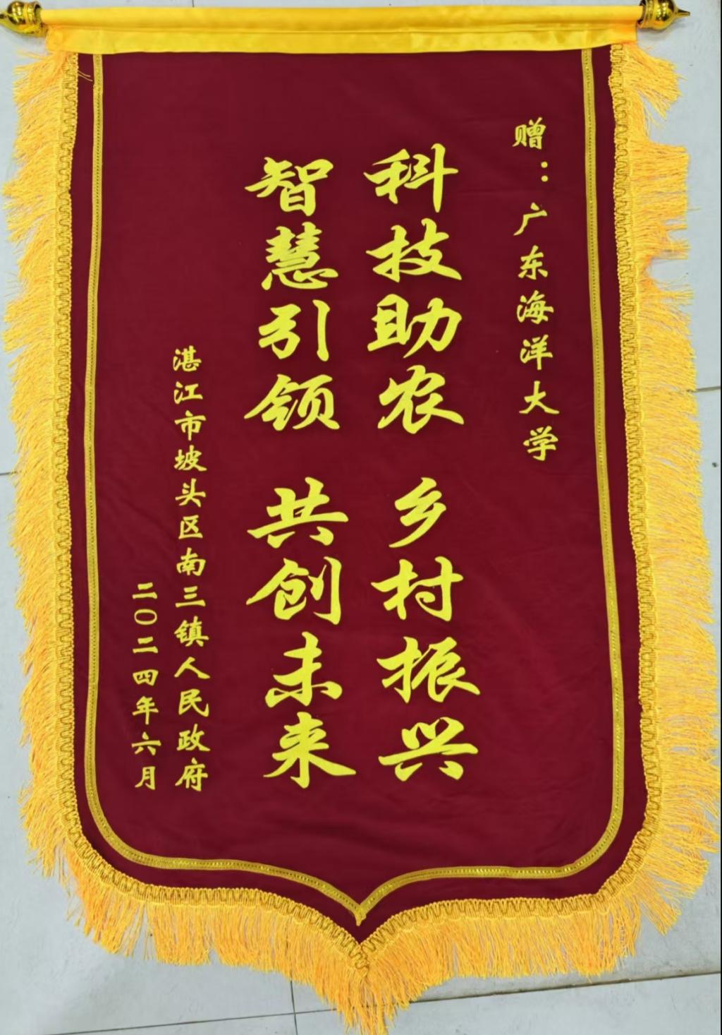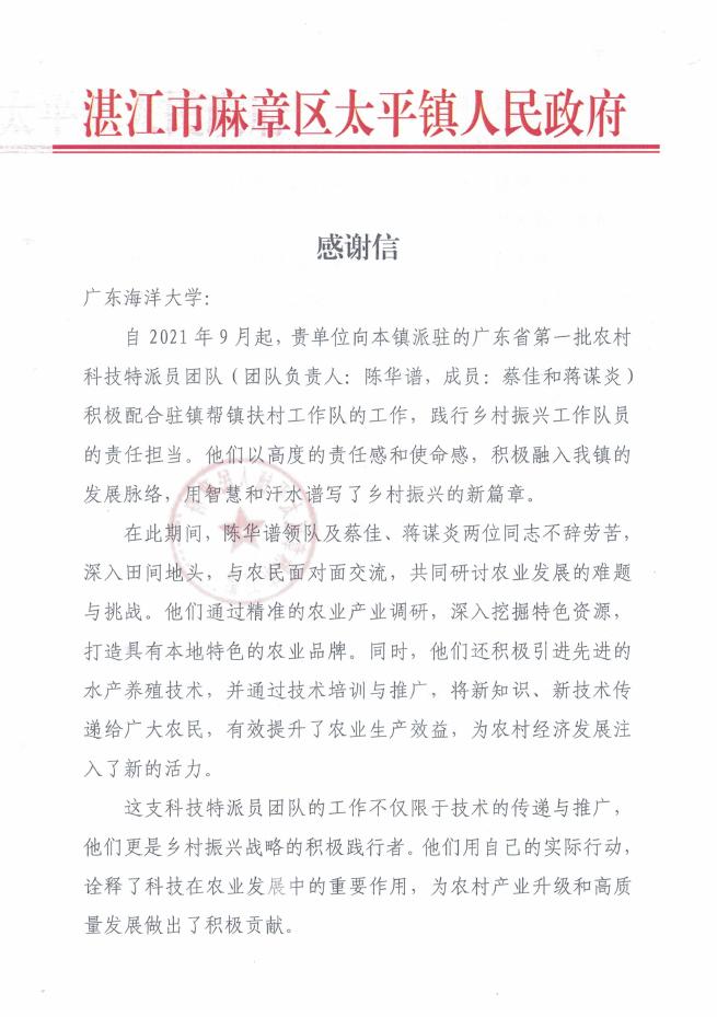 近日,水产学院收到来自湛江市麻章区太平镇人民政府的感谢信及坡头区南三镇的锦旗,对学院派出的两支广东省农村科技特派员团队做出的突出贡献表示感谢。