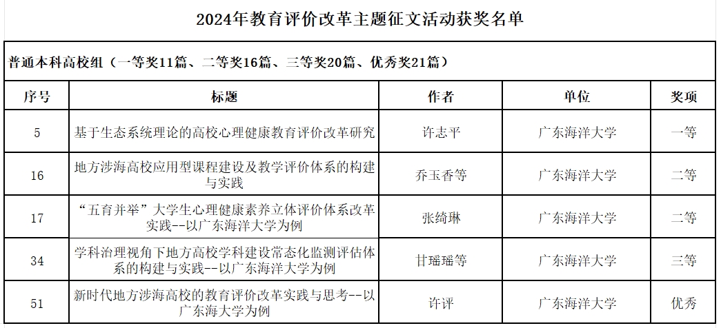 近日,广东省教育厅公布了2024年教育评价改革主题征文活动获奖名单,由开云官网报送的5篇征文作品获奖(其中一等奖1项、二等奖2项、三等奖1项、优秀奖1项),此外,开云官网还荣获“优秀组织奖”。