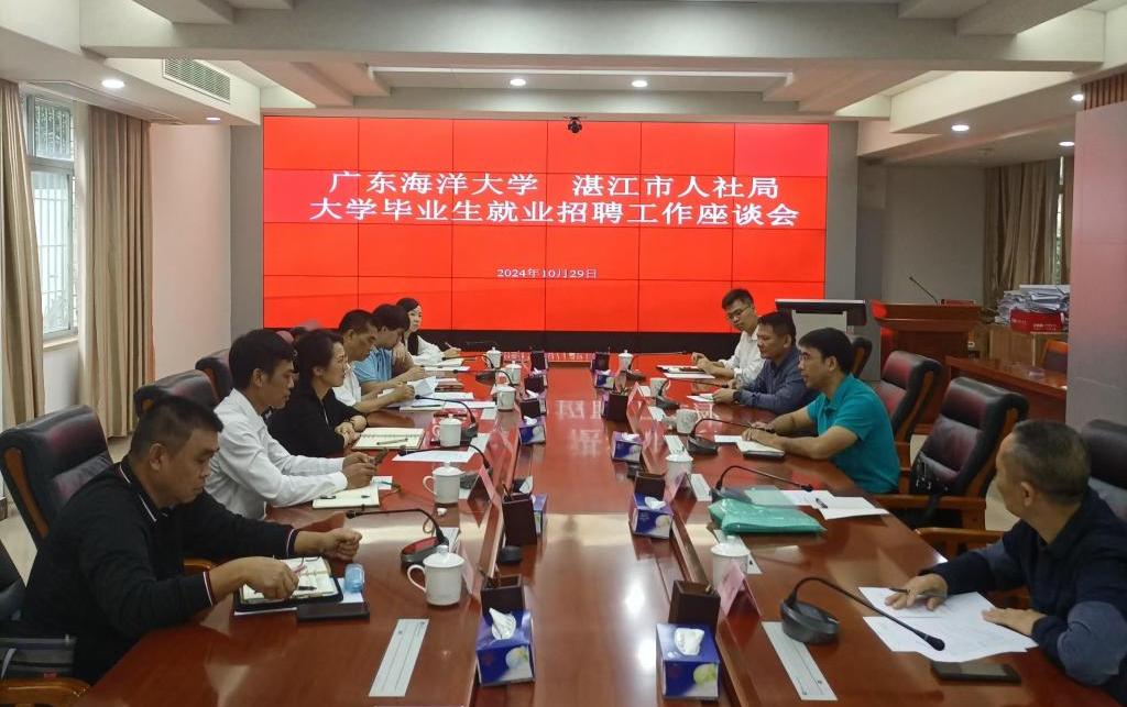 为加强政校企合作,进一步拓展毕业生就业市场,10月29日,学校招生与就业指导中心主任郑一鸣、副主任孙国恩,化学与环境学院党委副书记翁江峰、法政学院副书记黄善一行到湛江市人力资源和社会保障局走访交流。湛江市人力资源和社会保障局局长吴秋文、副局长陈接会见了郑一鸣一行,湛江市人力资源和社会保障局相关科室负责人参加交流座谈会。