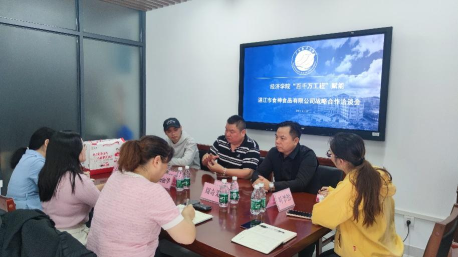 为了扎实推进“百千万工程”与“双百行动”,11月7日,经济学院在文科楼3号楼710会议室举行“百千万工程”赋能农产品企业战略合作洽谈会。会议由学院副院长杨丽华主持,经济系教师、广东省“百千万工程”农村科技特派员第二轮重点派驻团队负责人周奇美,国贸系教师吕晶晶,团委书记叶梦怡,湛江市食神食品有限公司董事长曹阳霞、副总经理刘国良和电商经理王泽宇参加了会议。