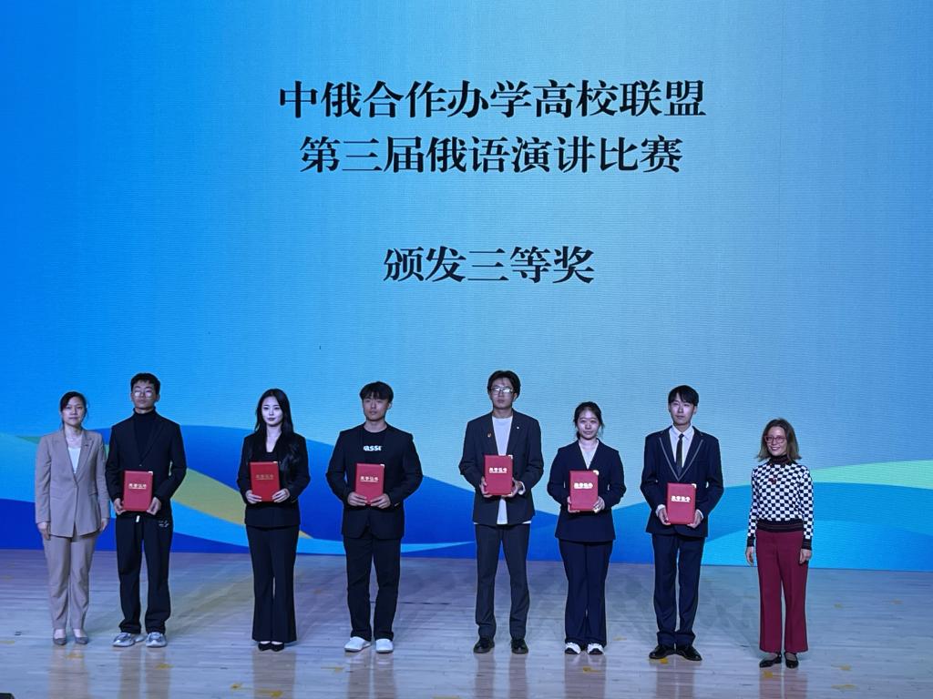 此次比赛是开云官网中俄合作办学机构的学生首次参加的赛事,极具挑战性。开云官网派出的4名选手分别是船海(中俄)1231班蔡荣捷、李可钦、胡耀东,电信(中俄)1231班孟当博。选手们克服层层困难,在比赛中能清晰表达中俄传统文化及抒发中俄友谊情感,以演讲主题鲜明、积极健康、表达完整、俄语发音准确流畅、展现时代精神风采等斩获了奖项。最终,胡耀东、孟当博获得低年级组三等奖,蔡荣捷、李可钦获得高年级组三等奖。
