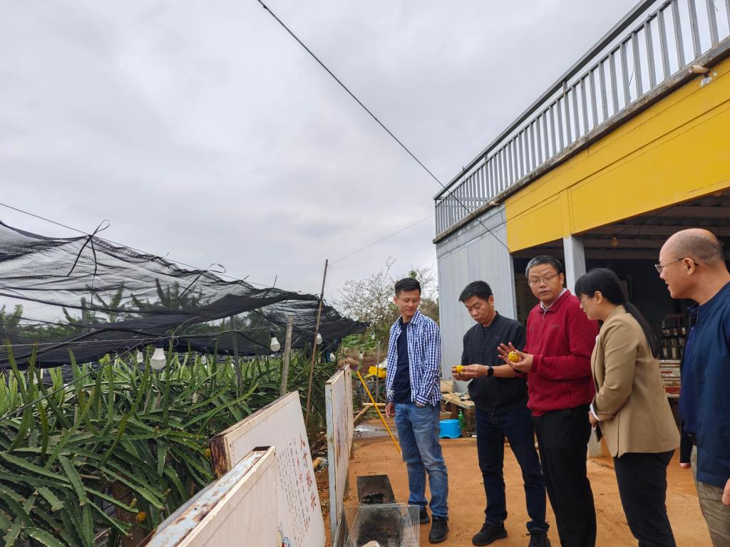 会后,特派员团队一行在官子润的陪同下,到宋皇村火龙果种植基地、远隆果业、北赛村冷库及南港村柠檬种植园等地进行实地调研,进一步了解当地亟待解决的农业生产、种植、运营等方面的技术问题。特派员团队与种植户深入交流了火龙果和柠檬种植和病虫害绿色防控技术,与企业负责人探讨硇洲镇火龙果和柠檬品质改良技术,挖掘火山火龙果品牌和开发农文旅产业。