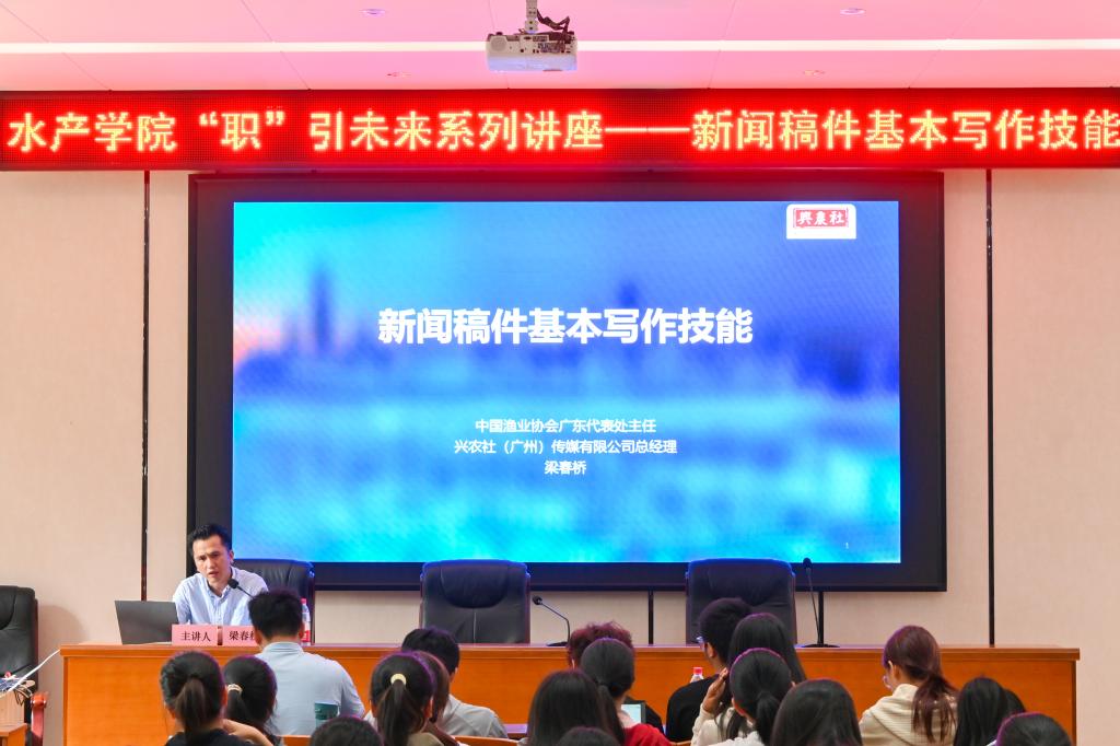 11月27日下午,水产学院“职”引未来系列讲座——新闻稿件基本写作技能培训活动在水产楼109教室举行。本次活动邀请的主讲嘉宾是水产学院2012届毕业生、中国渔业协会广东代表处主任、兴农社(广州)传媒有限公司总经理梁春桥,学院团委书记陈景阳,团学干事及各班干部等100余人参加活动。
