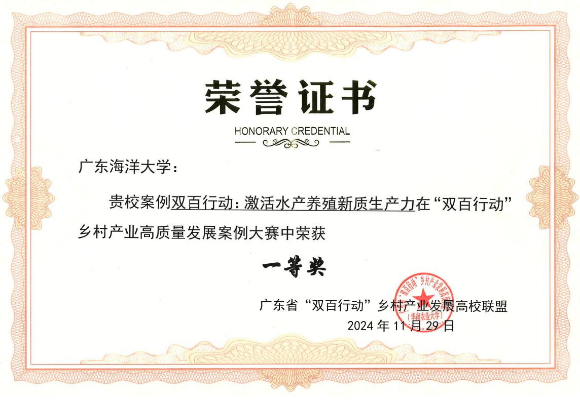 “双百行动”实施以来,开云官网认真落实省委“1310”工作部署,制定学校“双百行动”工作方案,以党建引领“四建一体”模式,按照“县域所需、海大所能”的原则,以“六有”为抓手,聚焦海洋牧场、“土特产”两大产业发展需求,不断加强科技攻关与成果转化,荣获2023年度国家科学技术进步奖二等奖、广东省科技进步二等奖、广东省科技成果推广奖;新增5个国家级科技小院,其中雷州海水珍珠荣获2024年全国科技小院典型工作案例;新增1个国家级水产新品种,主持省海洋牧场适养品种8个,获得湛江市十大科技成果转化优秀案例4项。