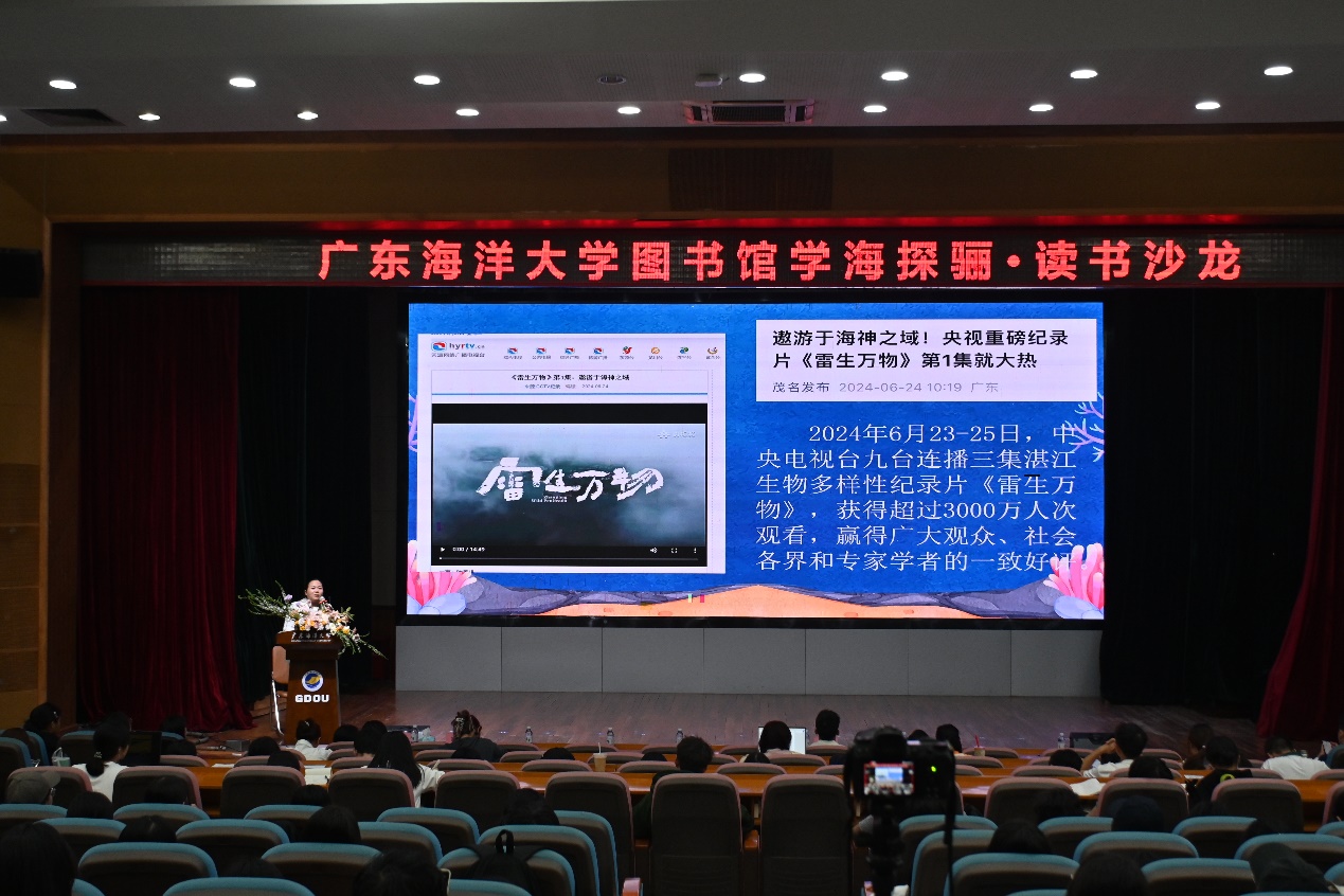12月6日晚,图书馆在广学楼多功能厅举办第四十二期“学海探骊”读书沙龙,本期读书沙龙主题为“穿越海陆的万物共生之旅——央视纪录片《雷生万物》总策划与你面对面”,央视纪录片《雷声万物》总策划人、湛江市司法局党组书记、局长罗东玲受邀主讲。学校教辅单位、图书馆相关负责人,《雷生万物》制作团队和400多名学生参加了本次沙龙。本期沙龙活动由图书馆馆长陈碧主持。