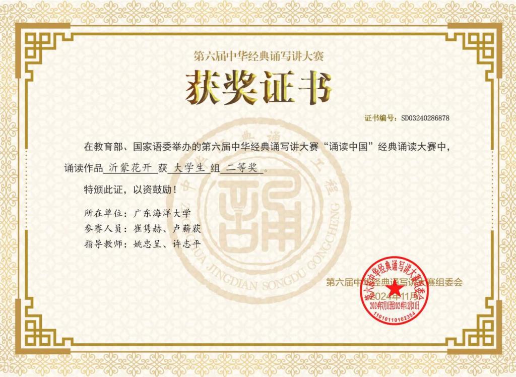近日,在教育部、国家语委主办的第六届中华经典诵写讲大赛“诵读中国”经典诵读大赛中,开云官网学子崔隽赫、卢薪荻的诵读作品《沂蒙花开》脱颖而出,荣获全国大学生组二等奖。
