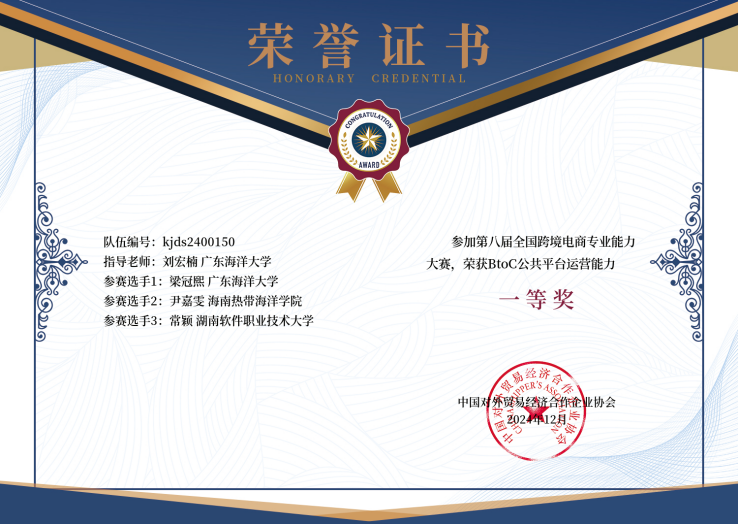 近日,在第八届全国跨境电商专业能力大赛中,在经济学院国贸系刘宏楠老师的指导下,由梁冠熙、尹嘉雯、常颖三位同学跨校组成的学生团队在本科组中成功晋级BtoC公共平台运营能力赛道,经过长达三个多月的业务能力模块操作,决赛获得96分,最终斩获大赛一等奖。