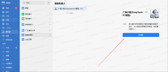 另外,现代教育技术中心在企业微信通讯录的智能机器人板块,全新上线了智能小助手“广海小现”(DeepSeek-R1模型)。这一智能小助手如同师生身边的贴心秘书,在学校日常管理工作中,为同学们提供了便捷的咨询渠道。无论是校园生活,还是规章制度等方面的问题,同学们都可以优先通过该入口进行咨询,大大提高了信息获取的效率,节省了时间和精力。