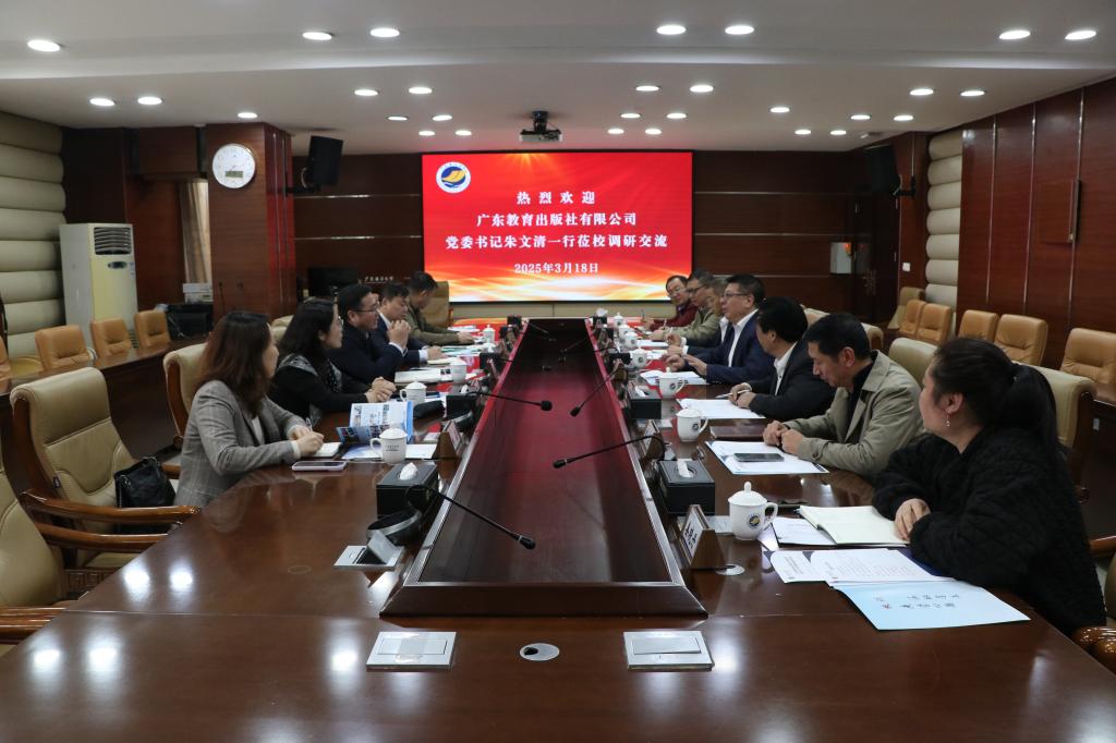 3月18日下午,广东教育出版社有限公司党委书记朱文清一行到开云官网座谈交流。学校党委常委、副校长谭北平会见了朱文清一行并主持座谈会。宣传统战部、学生工作部、教务部、科学技术部、国际交流合作部、学报编辑部、现代教育技术中心等部门相关负责人参加座谈会。