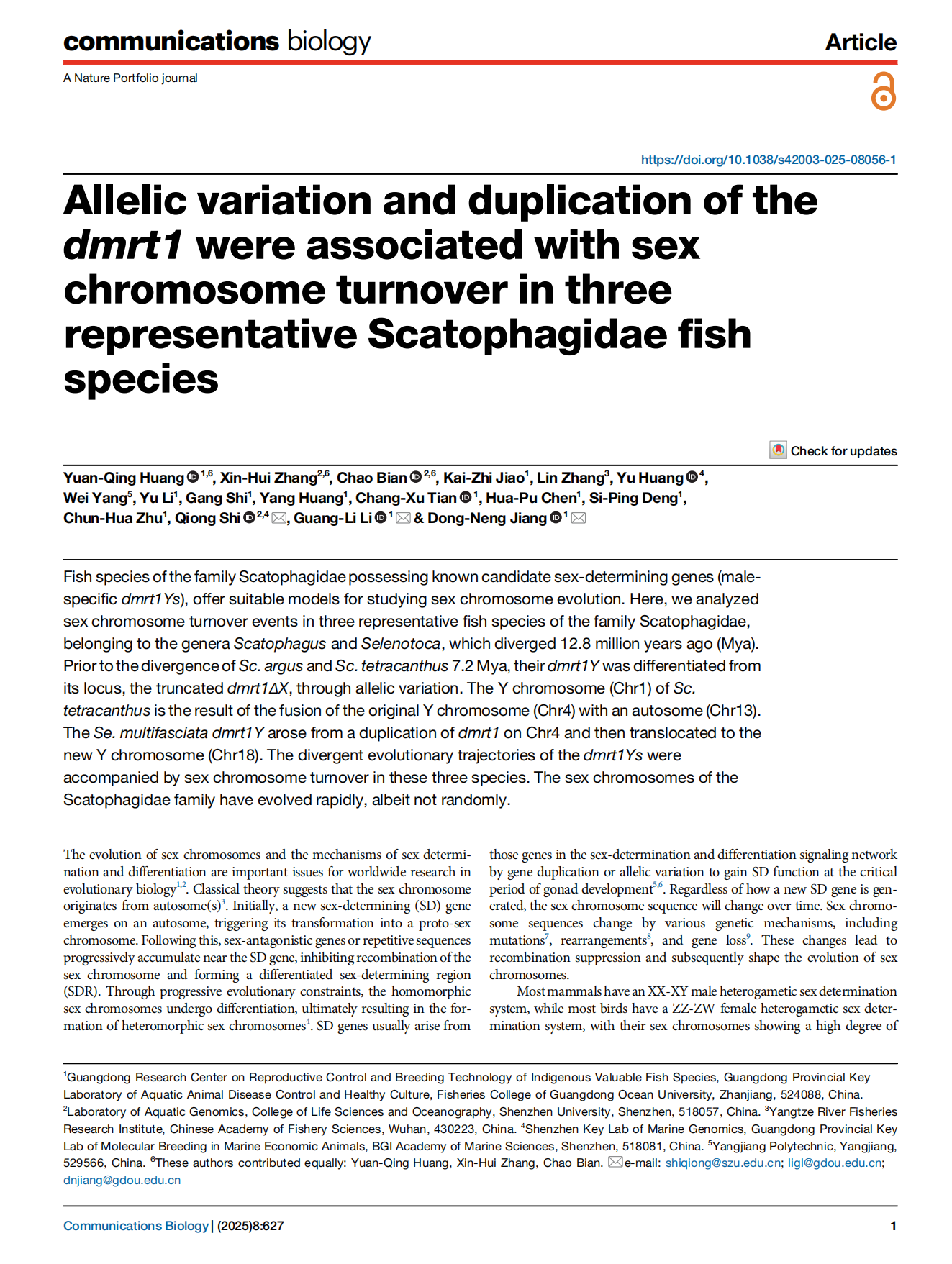 4月17日,水产学院鱼类遗传育种与增养殖团队在Nature旗下期刊Communications Biology(5年影响因子为5.6;JCI排名10/109;中科院生物学1区Top期刊)上发表题为《Allelic variation and duplication of the dmrt1 were associated with sex chromosome turnover in three representative Scatophagidae fish species》的研究论文。