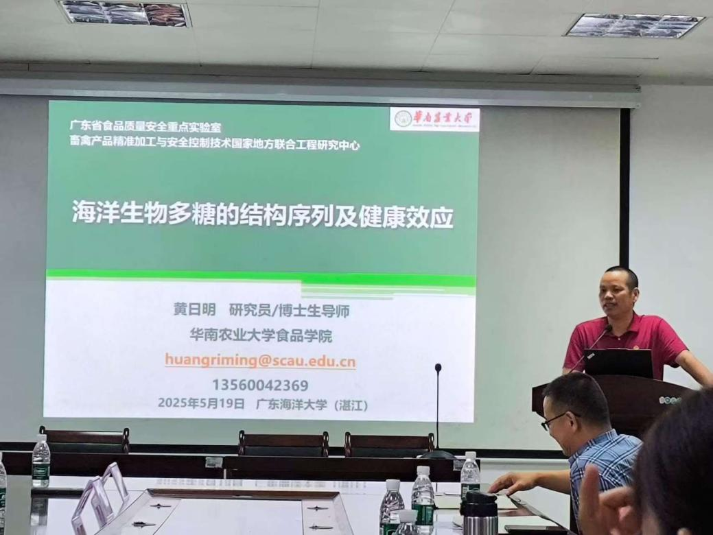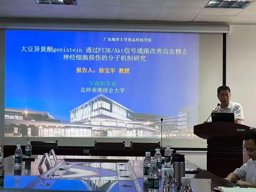 5月19日下午,北师香港浸会大学徐宝军教授和华南农业大学黄日明教授应邀到食品科技学院,在望海楼A105会议室分别作了题为《大豆异黄酮genistein通过PI3K/Akt信号通路改善高糖神经细胞损伤的分子机制研究》和《海洋生物多糖的结构序列及健康效应》的专题学术报告。报告会由副院长高加龙主持,钟赛意教授、张翼教授、陈雷教授、张杰良教授及海洋功能因子与营养健康创新团队部分教师与研究生共同聆听了报告。