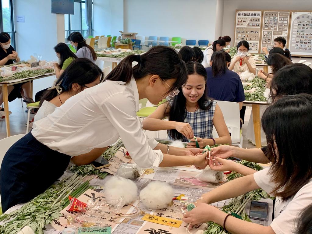 “艾香满园 粽情端午”主题活动在海纳楼207室创客空间举行。在工作人员的讲解和示范下,师生们兴致勃勃地动手实践。大家小心翼翼地填充艾草、缝合香囊、系上流苏,一针一线中寄托着对健康平安的美好祈愿。挑选艾草、搭配花材、精心捆扎包装,一束束清雅别致、寓意驱邪避疫的艾草花束在师生们的巧手中诞生。一针一线间,艾草清香弥漫校园,传统技艺与现代创意碰撞出文化火花。