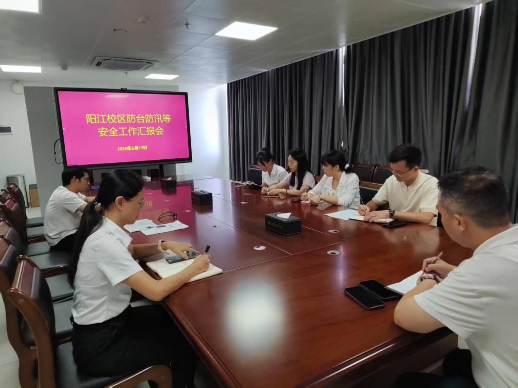 为切实保障校园安全稳定,有效应对今年第1号台风“蝴蝶”,6月13日下午,阳江校区党委副书记麦冬宁组织召开校区防汛防台专项工作会议,并对校区重点区域进行安全检查。后勤服务部部长祝敏丹及部门工作人员、物业和医务室参加。