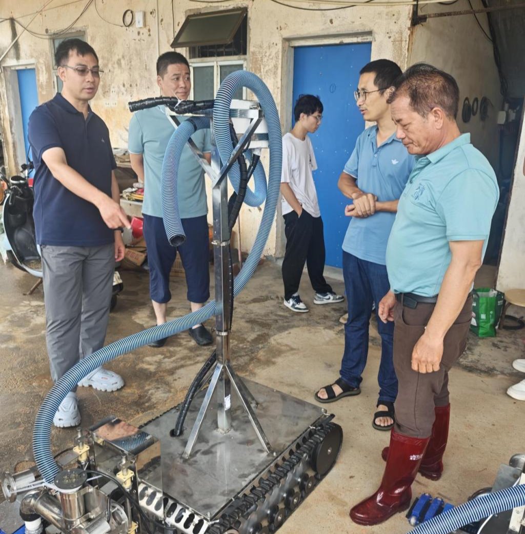 活动中,陈庆龙详细介绍了水下机器人的技术参数及应用功能。随后,该水下机器人在海山村港乐养殖场进行实地试用,帮助养殖户实时检测对虾的养殖状况。陈庆龙及其团队听取了养殖户对于水下机器人使用的反馈意见,并就其升级改造问题进行了深入探讨。