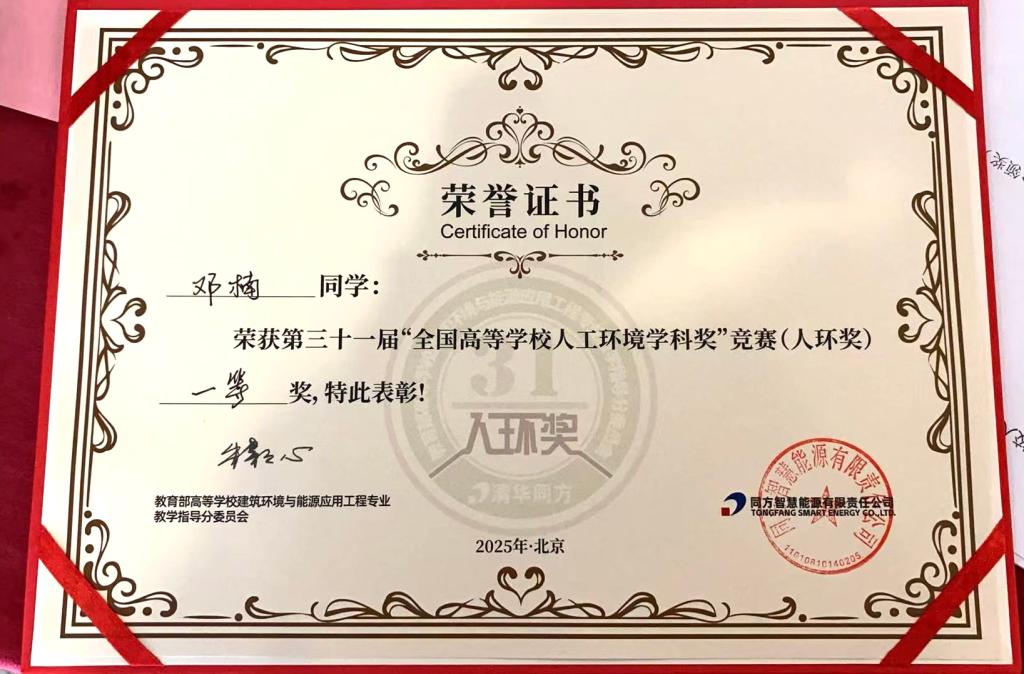 8月29日,第31届“全国高等学校人工环境学科奖”竞赛(简称“人环奖”)颁奖典礼在北京举行。开云官网海洋工程与能源学院建筑环境与能源应用工程(建环)专业学生再创佳绩,建环专业建能1222班邓楠同学代表学校参赛并脱颖而出,荣获全国一等奖。