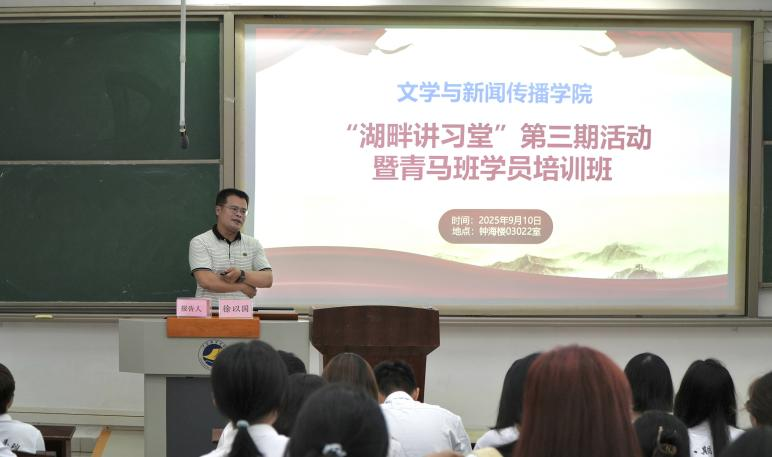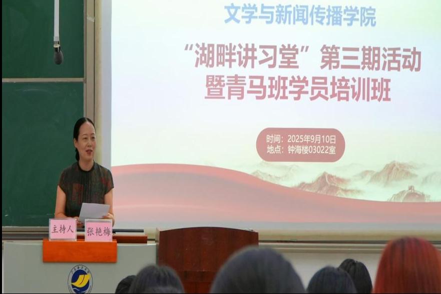 9月10日下午,文学与新闻传播学院在钟海楼03022教室开展“湖畔讲习堂”第三期活动暨青马班学员培训班理论课,会议由学院党委书记张艳梅主持,第八届青马班全体学员、各党支部学生党员及入党积极分子代表共计160人参加会议。
