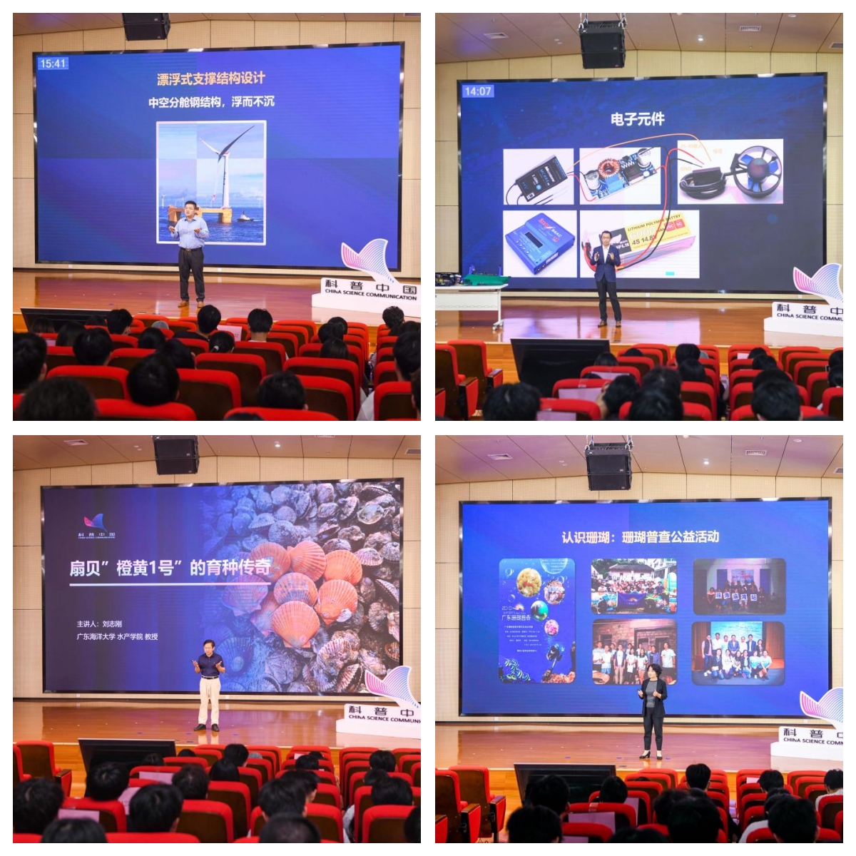 近年来,阳江因地制宜发挥海洋优势,建设“蓝色粮仓”,加快推进海洋经济高质量发展。本次活动还同步开展了“科普中国说”广东阳江专场活动,邀请专家聚焦海上风电与海洋牧场开展专题科普演讲,介绍相关领域的科研进展。华南理工大学船舶与海洋工程系主任、教授樊天慧在“驭风驭海,智创未来”的演讲中表示,深远海开发是海上风电的趋势,漂浮式风电技术是海上风电的“皇冠”。他介绍了海上风电“电力快递链”,讲解了漂浮式风电技术突破与锚泊系统优化,展现海洋科技助力绿色生活。随着人工智能技术的迅猛发展,船舶与海洋工程装备的制造和运维过程都逐渐智能化。中山大学海洋工程与技术学院副院长、教授谢鹏以“打造智能小船,启航逐梦深蓝”为题,展示了如何制作一款智能化海洋航行器模型,讲授了智能化海洋装备知识及研究进展。