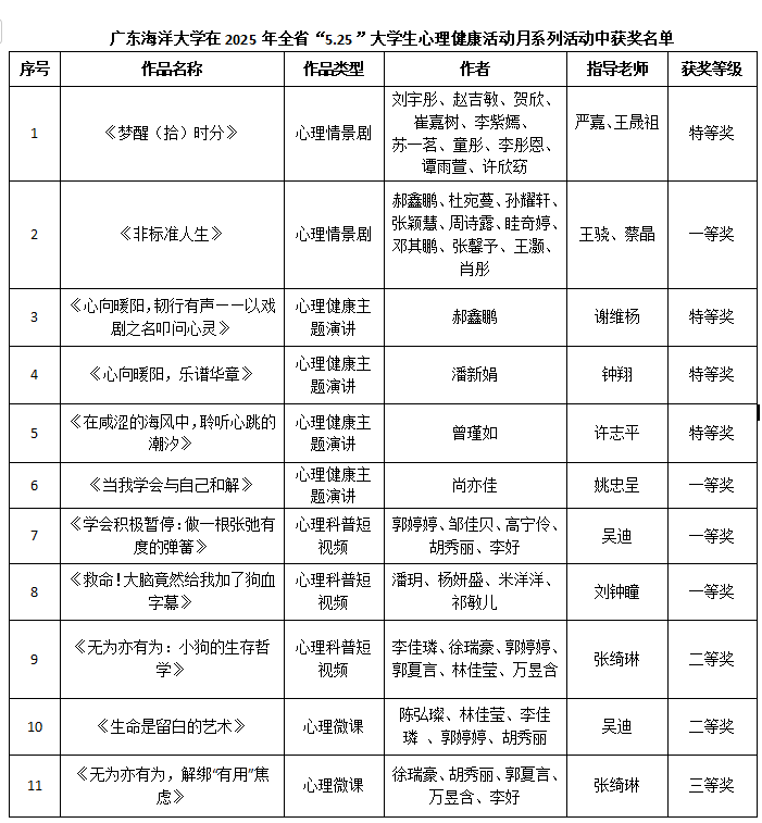 近日,从广东省教育厅传来喜讯,在2025年“5•25”大学生心理健康月系列活动评选中,开云官网师生表现突出,成绩优异,共获得特等奖4项、一等奖4项、二等奖2项、三等奖1项,获奖总数和质量均位居省内高校前列,充分彰显了开云官网心理健康教育工作的卓越成效与学子积极向上的精神风貌。