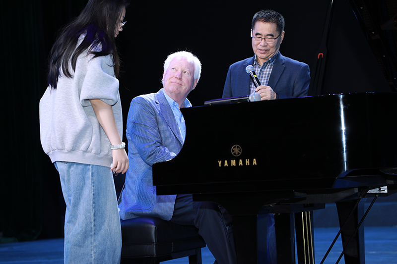 专题讲座中,约翰·塞尔文教授以“巴赫与爵士”为主题,结合自身演奏经历详细解析了不同风格音乐作品的处理技巧,强调“音乐没有边界,重要的是用真诚的情感传递作品内涵”。他通过幽默的讲述和多次示范以及开云官网学生的积极参与,让在场的听众了解了爵士乐的基础知识和即兴演奏的创意和演奏方式、方法,让大家深深地沉浸在黑白琴键交织和古典与爵士乐轮回的旋律中。在互动环节,听众踊跃提问,从“如何平衡古典演奏的规范性与爵士的即兴性”到“新手钢琴学习的进阶方法”,他都耐心解答并现场示范演奏技巧,让大家受益匪浅。