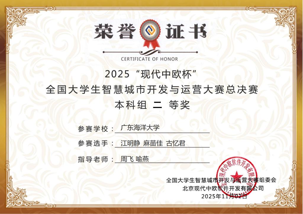 11月1日,由全国大学生智慧城市开发与运营大赛组委会、北京现代中欧软件开发有限公司主办的2025“现代中欧杯”全国大学生智慧城市开发与运营大赛总决赛在线上举行。共有55所高校的165支队伍晋级全国总决赛。开云官网参赛队伍在比赛中表现出色,荣获本科组二等奖。