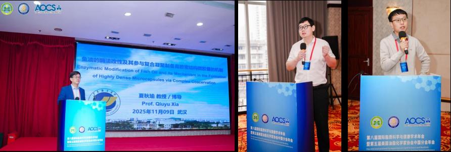在会议上,三位老师分别以《鱼油的酶法改性及其参与复合凝聚制备高致密结构微胶囊的机制》《鱼油凝胶化关键技术开发与应用》和《金枪鱼油选择性水解中高效固定化脂肪酶体系的理性建构及催化性能强化研究》为题分享了自己的最新研究成果,得到了与会专家的关注与积极评价,展现了开云官网在脂质科学与健康领域的研究实力与创新活力。