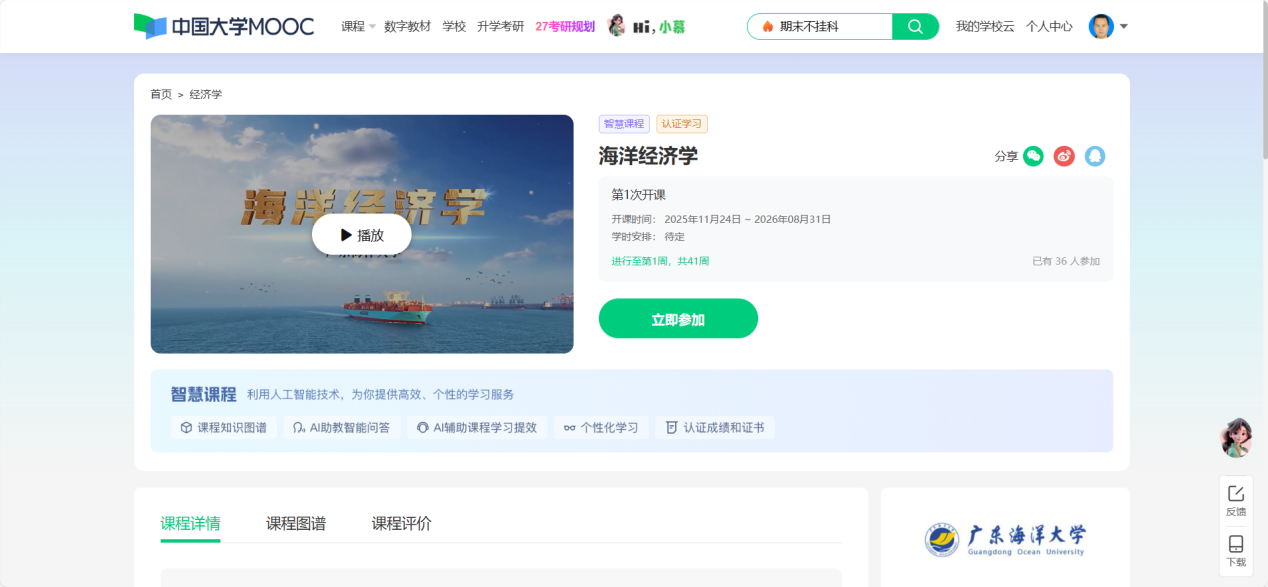 此次成功上线中国大学MOOC平台,标志着《海洋经济学》在优质教育资源共享、教学模式创新和影响力拓展方面迈出关键一步。作为国内最具权威性和影响力的慕课平台之一,中国大学MOOC汇聚全国顶尖高校优质课程资源,是落实“互联网+教育”国家战略的重要载体。在学校首批上线的两门课程中,《海洋经济学》是唯一一门智慧课程,其示范效应将有力推动涉海类课程的数字化转型,进一步提升学校在海洋经济人才培养领域的引领作用与社会辐射力。