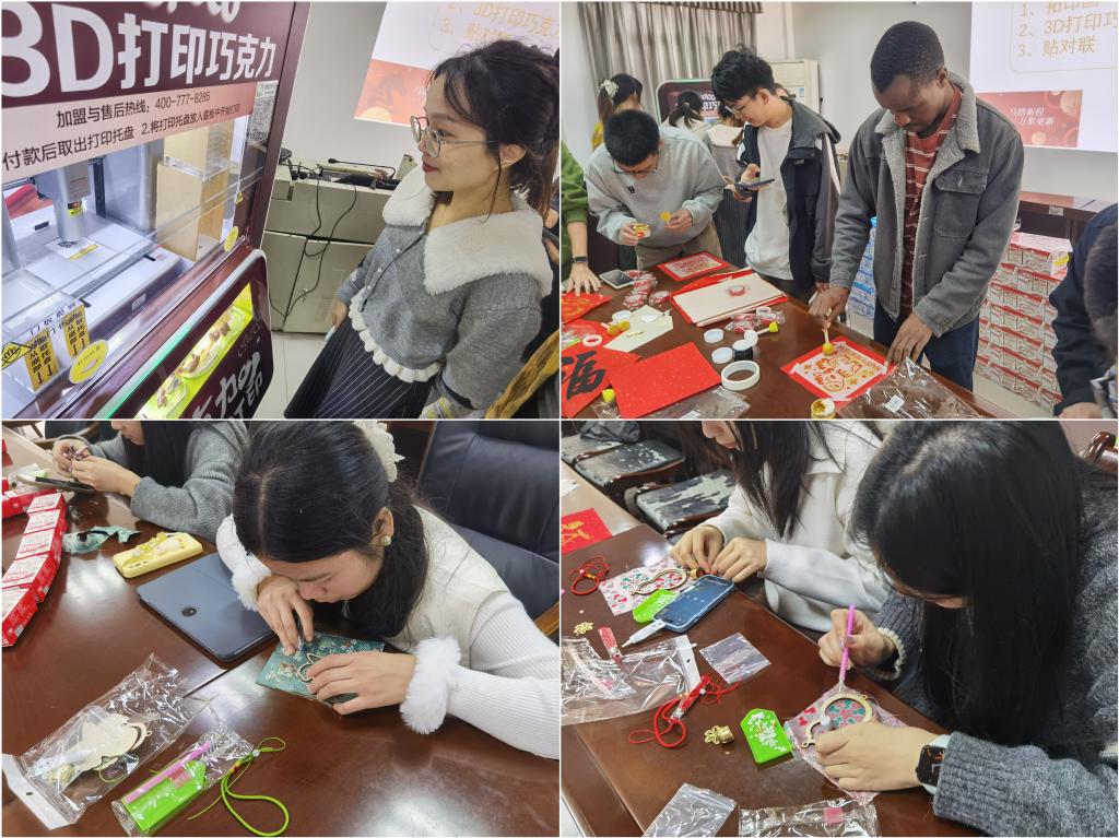 罗智勇代表学院领导向大家致以节日的问候,并亲切叮嘱假期安全注意事项,鼓励大家劳逸结合,度过一个平安、充实、有收获的寒假。活动现场,写春联、拓印画、做非遗手工风铃等传统年俗引人驻足,而最具学科特色的莫过于3D巧克力打印,同学们将科研中熟悉的数字建模转化为创造甜蜜的工具,亲手打印出独一无二并且可食用的甜蜜作品。学院优秀校友、燕塘乳业负责人心系母校,为留校同学送来了寓意健康的新春慰问礼品。这份来自“老学长”的关怀,与现场热烈的活动交织,生动诠释了学院“凝聚爱心、汇聚资源”的育人理念。