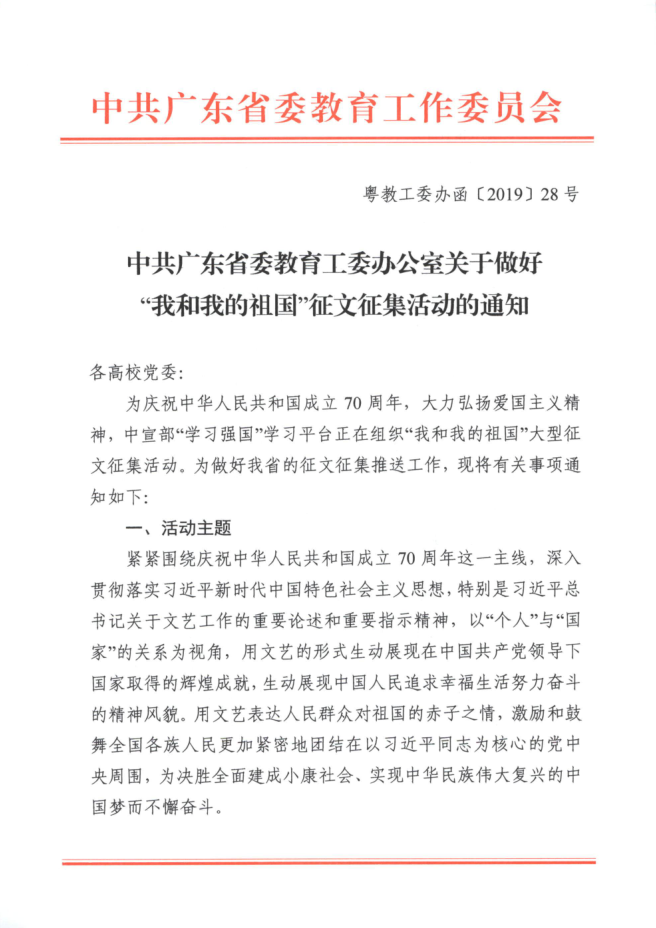 1、中共广东省委教育工委办公室关于做好“我和我的祖国”征文征集活动的通知