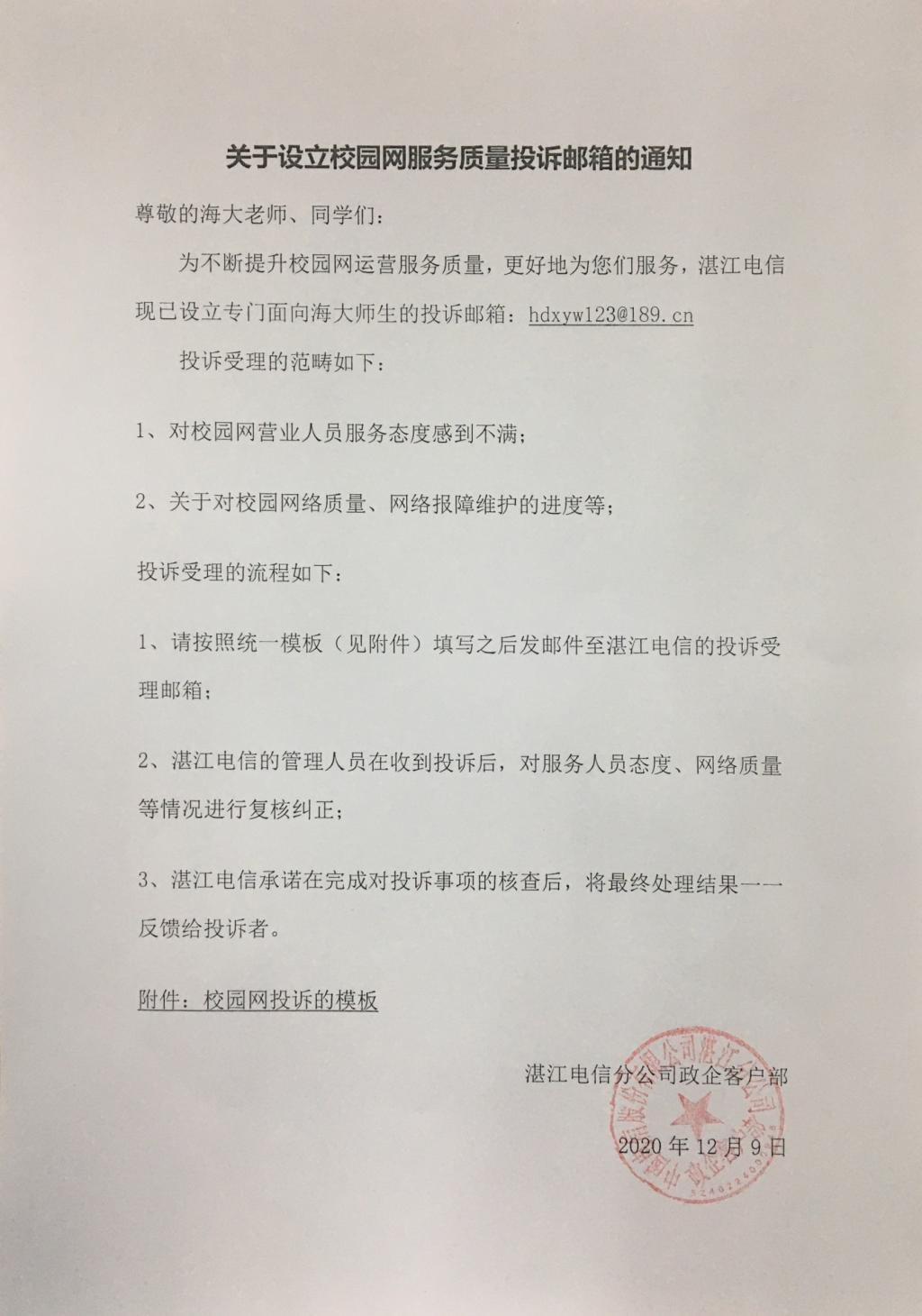关于设立校园网服务质量投诉邮箱的通知