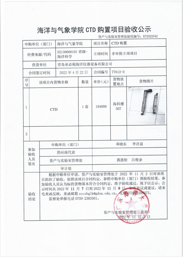 海洋与气象学院CTD购置项目验收公示